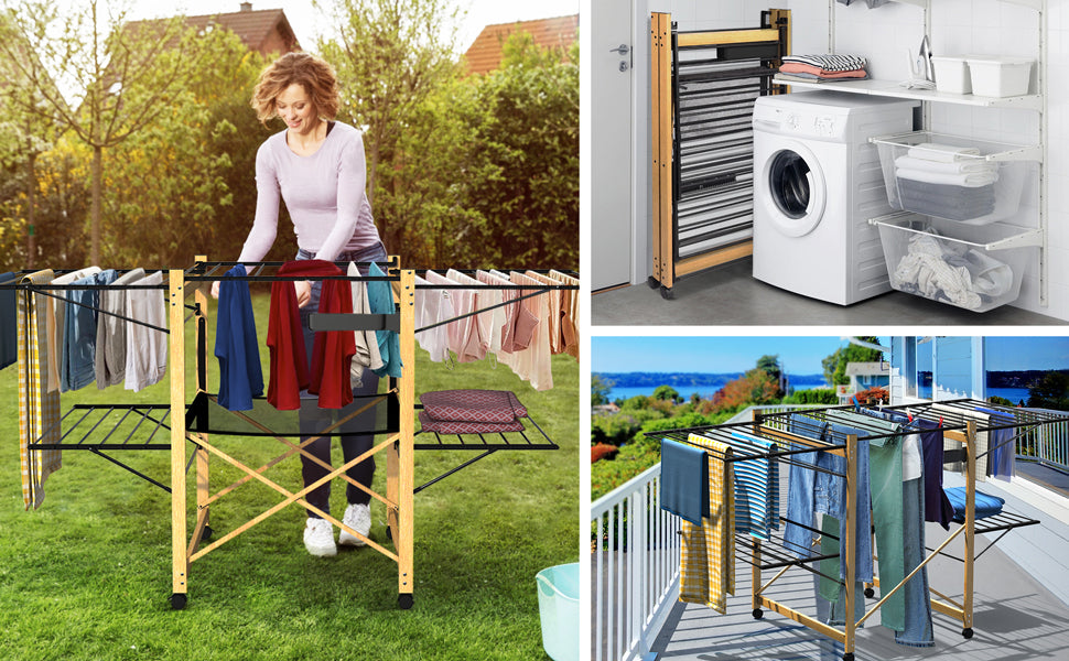 - With a wooden-style structure and stylish color, our drying airer is an elegant household furniture for family decoration and with its quick folding/unfolding system, you can use it almost instantly. In addition, its stable structure allows the drying rack to remain upright even when folded, taking up little space.!