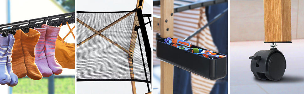 - The removable drying mesh allows for more efficient air circulation around clothes, speeding up the drying process and preventing wrinkles. In addition, it includes a practical adjustable storage box for clothespins and other accessories, ensuring easy and orderly access during drying. Finally, the integrated sock clips make it easy to hold small accessories.
