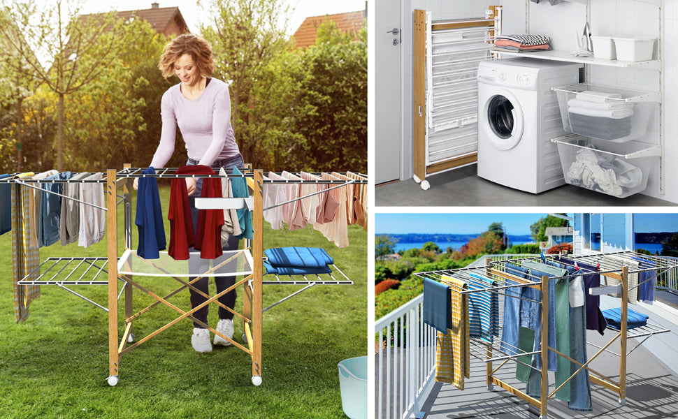 - Our wooden look drying rack's intelligent design offers drying surface up to 30 meters to maximize the available space without compromising the quality of drying.
