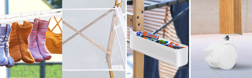 - The removable drying mesh allows for more efficient air circulation around clothes, speeding up the drying process and preventing wrinkles. In addition, it includes a practical adjustable storage box for clothespins and other accessories, ensuring easy and orderly access during drying. Finally, the integrated sock clips make it easy to hold small accessories.